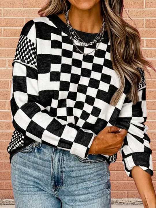 Drop Shoulder Sweater with Checkered Print